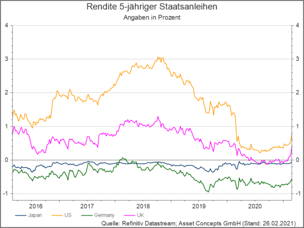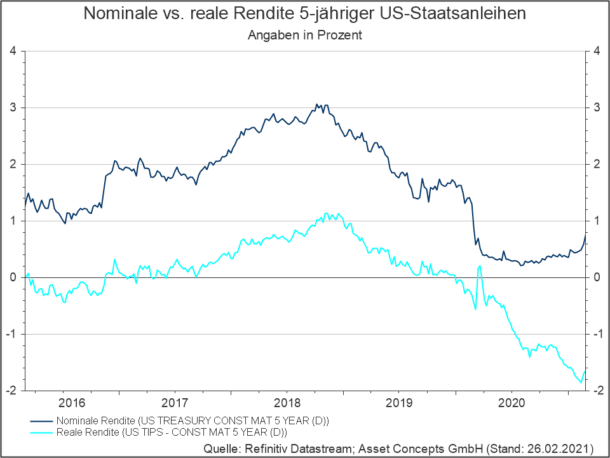 Auch im Euro-Raum wird ein Anstieg der Inflation erwartet. Im Gegensatz zu den USA zogen hier die Nominalzinsen allerdings an, wenn auch nicht im gleichen Ausmaß wie die Inflationserwartungen. Da sich die Nominalzinsen im Euro-Raum anders als in den USA allerdings noch immer deutlich im negativen Bereich befinden, beträgt auch hier die reale Rendite fünfjähriger Anleihen nahe-zu -2% p.a.