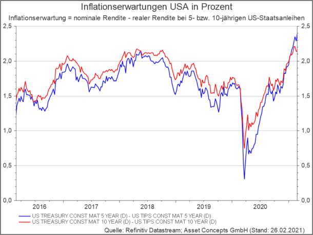 Im abgelaufenen Börsenmonat beschäftigten verstärkt Inflationssorgen die Anleger, welche auf die erwartete wirtschaftlichen Erholung nach Beendigung der Pandemie, bedingt durch Nachholeffekte, sowie die Konjunkturpakete der einzelnen Regierungen zurückzuführen sind. Entsprechend sind insbesondere in den USA die Inflationserwartungen zuletzt auf über 2% p.a. angestiegen, wie die nachfolgende Abbildung verdeutlicht.