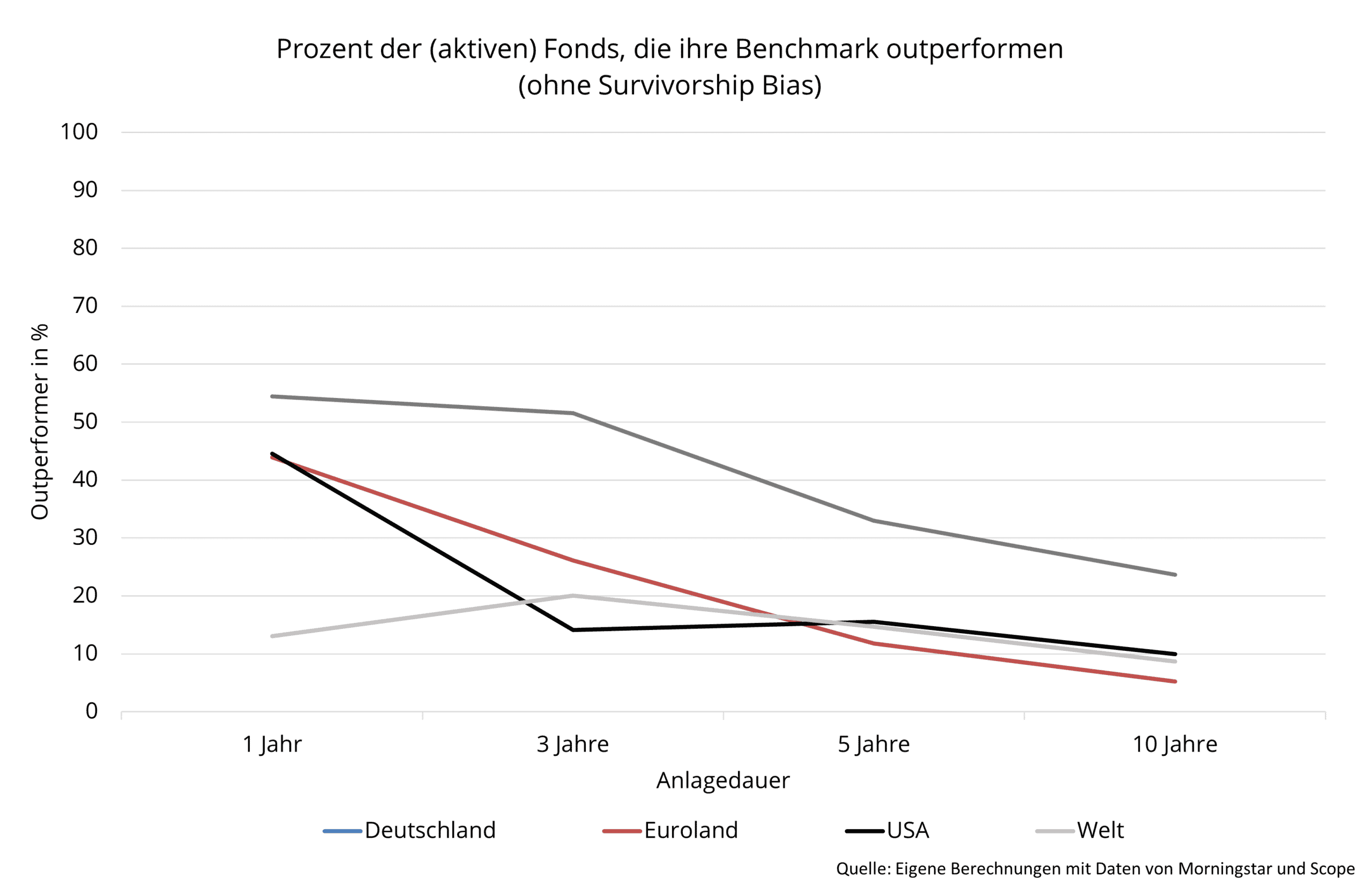 Im Fokus steht jedoch unabhängig von der kundenindividuellen Ausgestaltung der Anlagestrategie auch auf der Portfoliomanagementebene die wissenschaftliche Fundierung und (Banken-) Unabhängigkeit. So investieren wir auf der Einzelwertebene ausschließlich in breit gestreute Portfolien, die wir primär auf Basis von kosten- und steueroptimierten ETF-Investments abbilden. Durch ihre hohe Transparenz stellen die Exchange-Traded-Funds zudem eine sehr gute Basis für ein effizientes Risikomanagement dar. Aber auch aus Renditegesichtspunkten zeigen wissenschaftliche und empirische Untersuchungen, dass Indexinvestments (gegenüber aktivem Management) vielfach überlegen sind; also eine Bestätigung der Effizienzmarkthypothese.