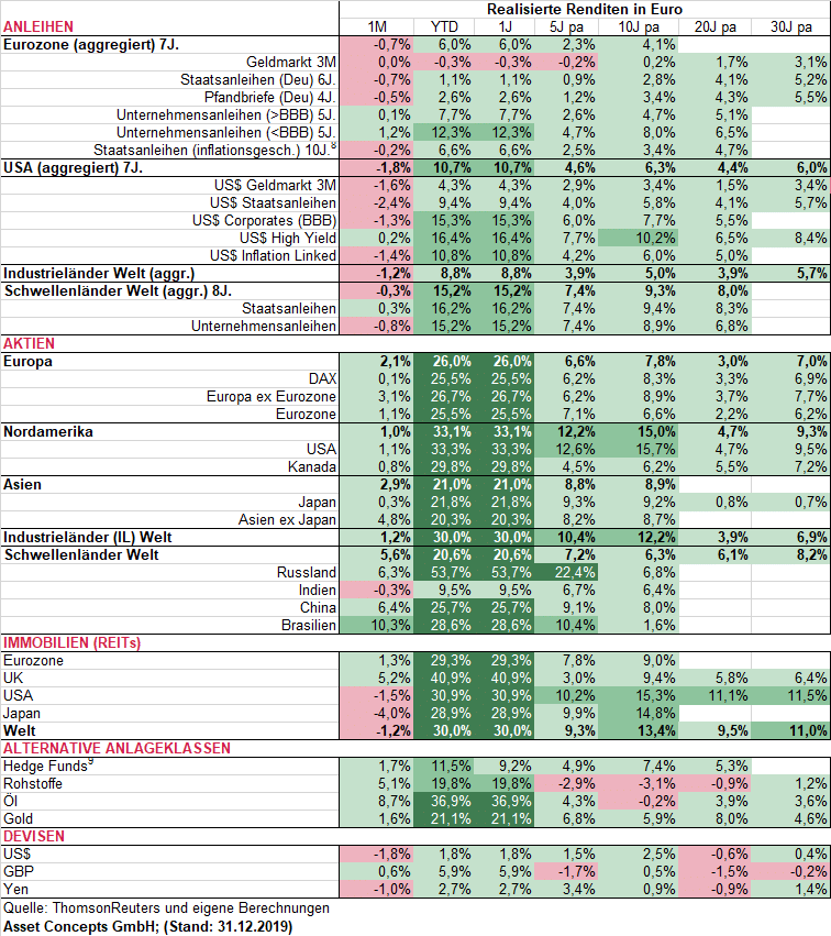 Das zurückliegende Börsenjahr hat eindrucksvoll bewiesen, dass die Entwicklung an den Kapitalmärkten nicht zuverlässig prognostizierbar ist. Wer hätte nach der Schwächephase Ende 2018 damit gerechnet, dass beispielsweise der Deutsche Aktienindex DAX im Jahr 2019 um über 25% steigt? Obwohl wir in unserem Kommentar zur Vermögensanlage Anfang 2019 darauf hingewiesen haben, dass mittel- bis langfristig auf ein schlechtes Jahr mit hoher Wahrscheinlichkeit ein gutes Börsenjahr folgt, haben auch wir eine so beeindruckende Wertentwicklung wie im Jahr 2019 nicht erwartet. Wie die nachfolgende Tabelle verdeutlicht, weisen alle Anlageklassen, mit Ausnahme von Euro-Geldmarktanlagen, für das vergangene Jahr eine positive Wertentwicklung auf, wobei die Aktienmärkte mit Renditen von in der Regel deutlich über 20% den Vogel abschossen.