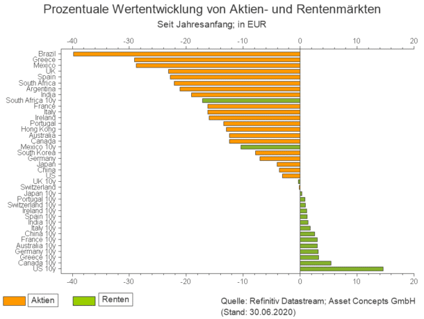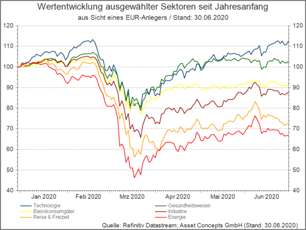 In den ersten sechs Monaten des Jahres 2020 bestimmte auch an den Kapitalmärkten vor allem ein Wort das Geschehen: Corona. Während in den ersten beiden Monaten des Jahres die Hoffnung überwog, den Corona-Virus in China und einigen anderen asiatischen Ländern einzudämmen und eine weltweite Ausbreitung zu verhindern, zerschlug sich diese Hoffnung im März und führte zu deutlichen Verwerfungen an den internationalen Kapitalmärkten, wie in unserem Kommentar zur Vermögensanlage (KzV) von März und April 2020 ausführlich dargestellt.