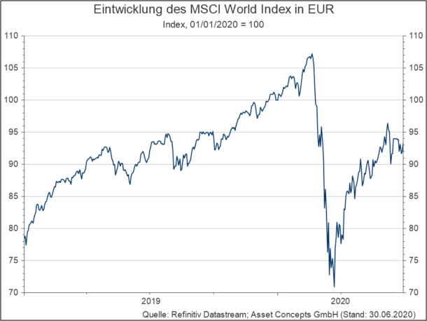Nach den überaus kräftigen Kursrückgängen im Februar und März hat der globale Aktienmarkt (gemessen am MSCI Welt-Aktienindex), seit April allerdings mehr als die Hälfte seiner Kursverluste wieder wettgemacht. Wie so häufig nach „Aktienmarktcrashs“, war trotz der umfangreichen geldpolitischen Lockerungsmaßnahmen der Notenbanken und der fiskalpolitischen Stützungsmaßnahmen vieler Staaten eine Erholung in diesem Ausmaß und in so kurzer Zeit für die meisten Anleger überraschend. Zumal sich zunächst die Konjunkturmeldungen mit negativem Ausblick, wie beispielsweise „Rekordarbeitslosigkeit in den USA“ und „stärkste Rezession der Weltwirtschaft in der Nachkriegszeit“, häuften, wie in unserem KzV vom Mai 2020 beschrieben.