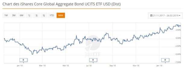 Im Kommentar zur Vermögensanlage Oktober 2018 hatten wir zuletzt einen Blick auf das risikoarme Teilportfolio in unseren Kundendepots geworfen und gezeigt, dass besonders in Stressphasen an den Aktienmärkten der „iShares Core Global Aggregate Bond ETF“, der die Wertentwicklung der globalen Anleihemärkte der Industrieländer abbildet, typischerweise eine ausgeprägte positive und damit gegenläufige und die Kursverluste an den Aktienmärkten dämpfende Performance aufweist. Dies hat sich in den letzten Monaten des Jahres 2018 dann auch entsprechend unserer Erwartung bewahrheitet, wie man an dem nachfolgenden Wertentwicklungschart des ETF in Euro seit Auflegung erkennen kann (Quelle: justETF.com, 26.02.2019):