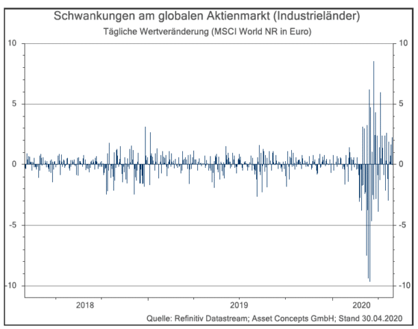 Ein gutes Maß für den Pessimismus, oder anders ausgedrückt die Unsicherheit der Anleger, sind die täglichen Kursschwankungen am Aktienmarkt, die, wie wir in unserem letzten Kommentar zur Vermögensanlage ausgeführt haben, im März noch stärker waren als während der Finanzkrise in den Jahren 2008/2009. Wie das nachfolgende Schaubild verdeutlicht, haben sich die Kursschwankungen im April deutlich verringert. Demzufolge ist es auch nicht überraschend, dass mit der offensichtlich „verringerten“ Unsicherheit am Aktienmarkt die Kurse zuletzt deutlich angezogen haben.