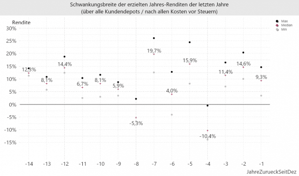 In den Diagrammen findet sich jeweils das Maximum, Minimum sowie der Median (Erläuterung) der erzielten Renditen. Die Differenzen zwischen den erzielten Erträge resultieren vor allem aus den unterschiedlichen Rendite-/Risikoprofilen der Kundendepots.